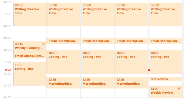 Rather than continuing this frustration, right now I am managing things in an analog and digital combo. The first is a paper planner (the Moleskine Weekly Planner that I reviewed here) and a separate ‘work’ calendar that chunks times of the day into very high level categories (for example, editing time vs ‘line edit of x book’).