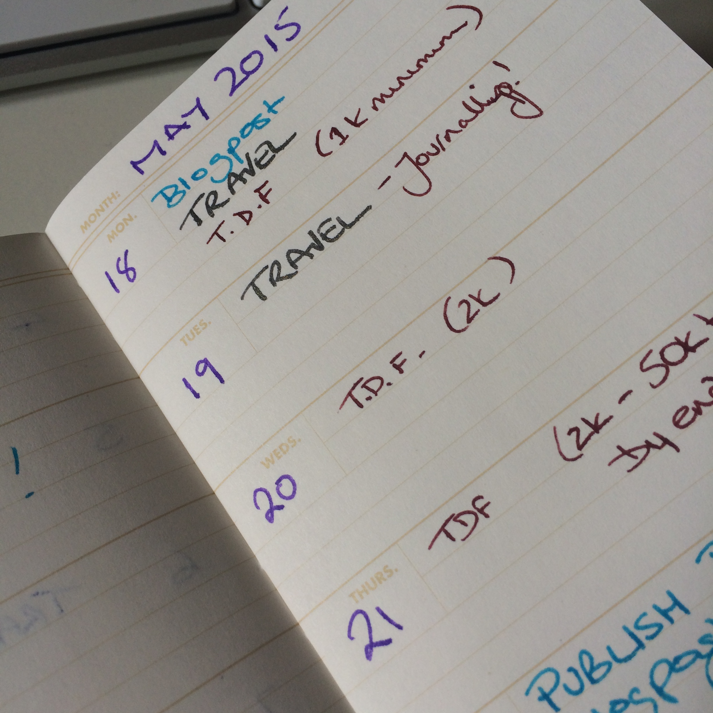 Ignore the terrible handwriting, please. The only ‘calendar’ style item that goes into the Field Note datebook is when I’m travelling. This has an impact on my 6am morning routine sometimes, so I need to make sure I do extra planning to negate that as much as possible. The rest is just a simple scheduling approach to writing projects that I need to get done, whether they are media (such as blogposts), creative endeavours (the actual writing itself and a goal word count) and then any other writing related activities that are more of a business nature.