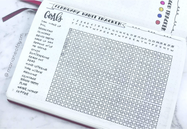 This is the kind of tracker I use. I can just about manage to draw small squares without going too far wrong. With the habits listed down the left hand side and the dates across the top, it gives a quick and easy visual of missed days and progress.