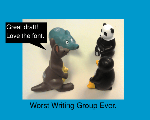 All too common is the giant writing group, where you only have two minutes and forty seven seconds to read 800 words and get a whopping 2 minutes of feedback. One of those minutes is usually wasted on deciding on who goes first. Not exactly useful.
